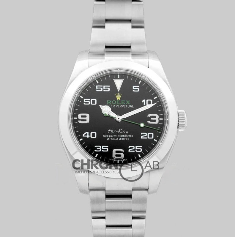 Το διαχρονικό μοντέλο Air-King έχει αντιγραφεί με τις τελευταίες και πιο σύγχρονες τεχνικές δημιουργίας πιστών αντιγράφων Replica AAA, έτσι ώστε ακόμη και αν ανοιχτεί από οποιοδήποτε κοσμηματοπωλείο, ο μηχανισμός (διαθέτει Perpetual Type ETA 3135) να είναι όμοιος όπως τα γνήσια Rolex Replica. Κάθε μέρος του ρολογιού μέσα και έξω έχει αναπαραχθεί με τα ακριβή γραμμάρια που έχουν μεμονομένα και συνολικά τα εξαρτήματα του γνήσιου Rolex Replica Έχει λειτουργία σε ώρα, λεπτό και δευτερόλεπτο και φέρει ένδειξη ημερομηνίας. Το σώμα είναι κατασκευασμένο από ανεξίτηλο ατσάλι (Stainless Steel), υποαλλεργικό με απόχρωση Τ20 και έχει 10 έτη εγγύηση χρώματος. Το μπρασελέ του έχει αναδιπλούμενο κούμπωμα ασφαλείας Oysterlock με EasyLink 5 χιλιοστών. Είναι αδιάβροχο, στεγανοποιημένο έως 10 bar και έχει ρυθμιστική βίδα με ανάγλυφη κορόνα. Ο ζαφειρένιος κρυστάλλος είναι αρκετά ανθεκτικός σε γρατσουνιές