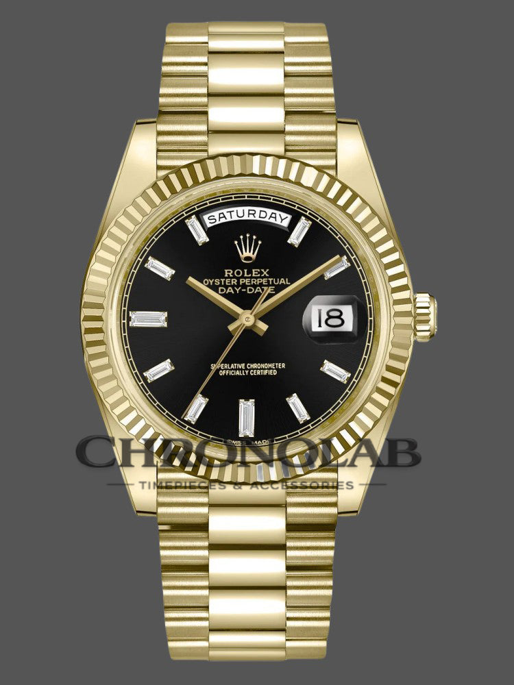 Rolex-Style Day-Date 228238 Black Diamond Dial Fluted Bezel Yellow Gold 40MM Men’s Luxury Watch