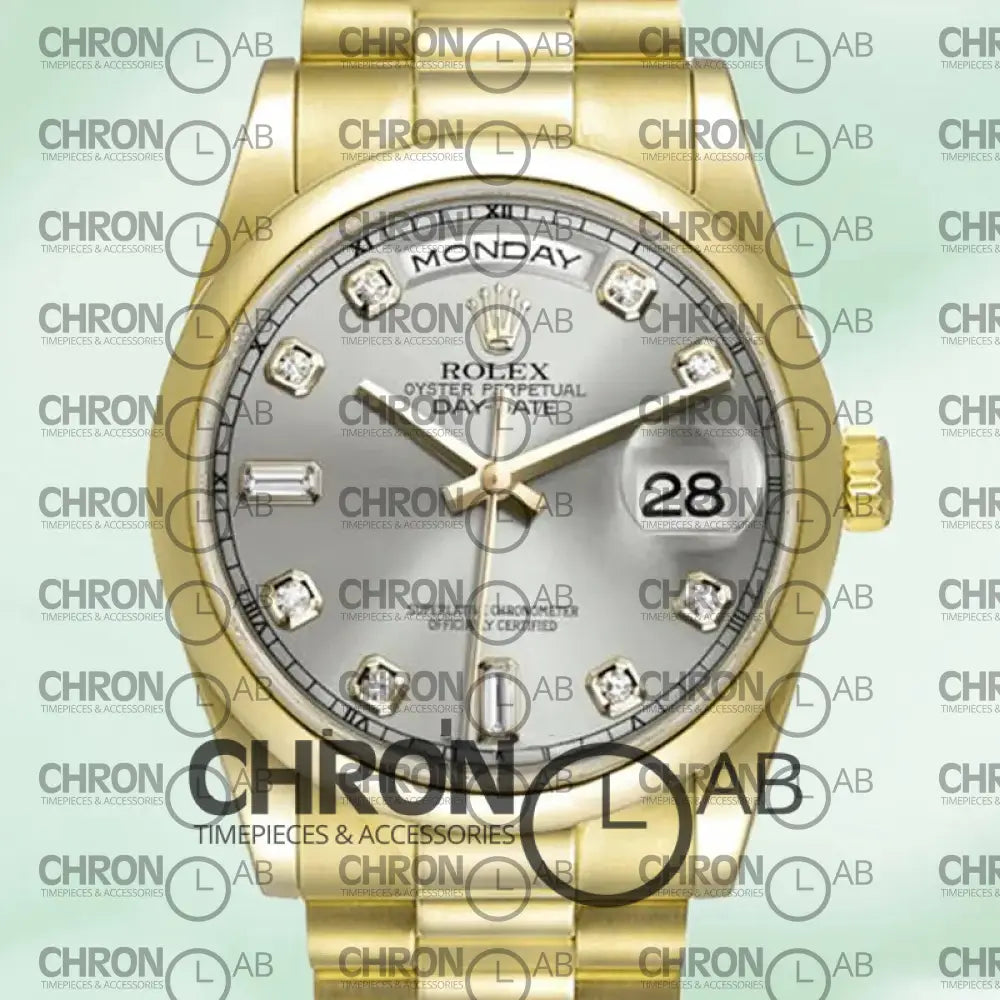 Το διαχρονικό μοντέλο Day-Date Swiss Made έχει αντιγραφεί με τις τελευταίες και πιο σύγχρονες τεχνικές δημιουργίας πιστών αντιγράφων Replica AAAAA, έτσι ώστε ακόμη και αν ανοιχτεί από οποιοδήποτε κοσμηματοπωλείο, ο μηχανισμός (διαθέτει Genuine Swiss Clone ETA 3135 movement) να είναι όμοιος όπως τα γνήσια Rolex Replica. Κάθε μέρος του ρολογιού μέσα και έξω έχει αναπαραχθεί με τα ακριβή γραμμάρια που έχουν μεμονομένα και συνολικά τα εξαρτήματα του γνήσιου Rolex Replica Έχει λειτουργία σε ώρα, λεπτό και δευτερόλεπτο και φέρει ένδειξη ημερομηνίας. Το σώμα είναι κατασκευασμένο από ανεξίτηλο ατσάλι (Stainless Steel), υποαλλεργικό με απόχρωση Τ20 και έχει 10 έτη εγγύηση χρώματος. Το μπρασελέ του έχει αναδιπλούμενο κούμπωμα ασφαλείας Oysterlock με EasyLink 5 χιλιοστών. Είναι αδιάβροχο, στεγανοποιημένο έως 10 bar και έχει ρυθμιστική βίδα με ανάγλυφη κορόνα. Ο ζαφειρένιος κρυστάλλος είναι αρκετά ανθεκτικός σε γρατσουνιές και έχει μεγέθυνση (επιπέδου 2.5x) πάνω από την ημερομηνία