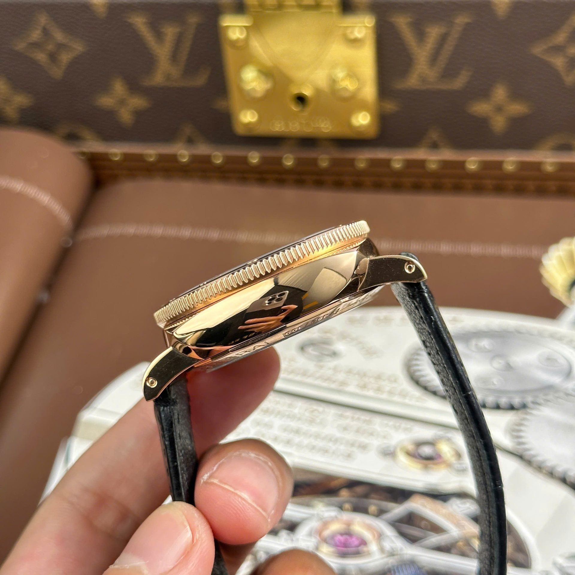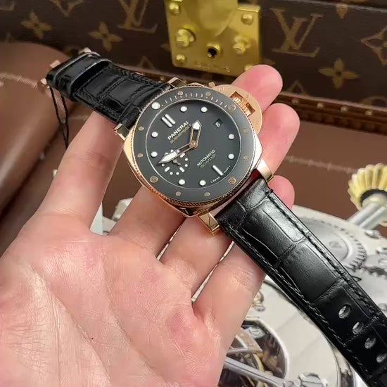 Η περιστρεφόμενη στεφάνη σε ροζ χρυσό και το μαύρο δερμάτινο λουράκι ολοκληρώνουν τον εκλεπτυσμένο αλλά ταυτόχρονα σπορ χαρακτήρα. Το ρολόι συνδυάζει τον αυθεντικό σχεδιασμό της Panerai με την υψηλή ποιότητα κατασκευής της VS Factory.