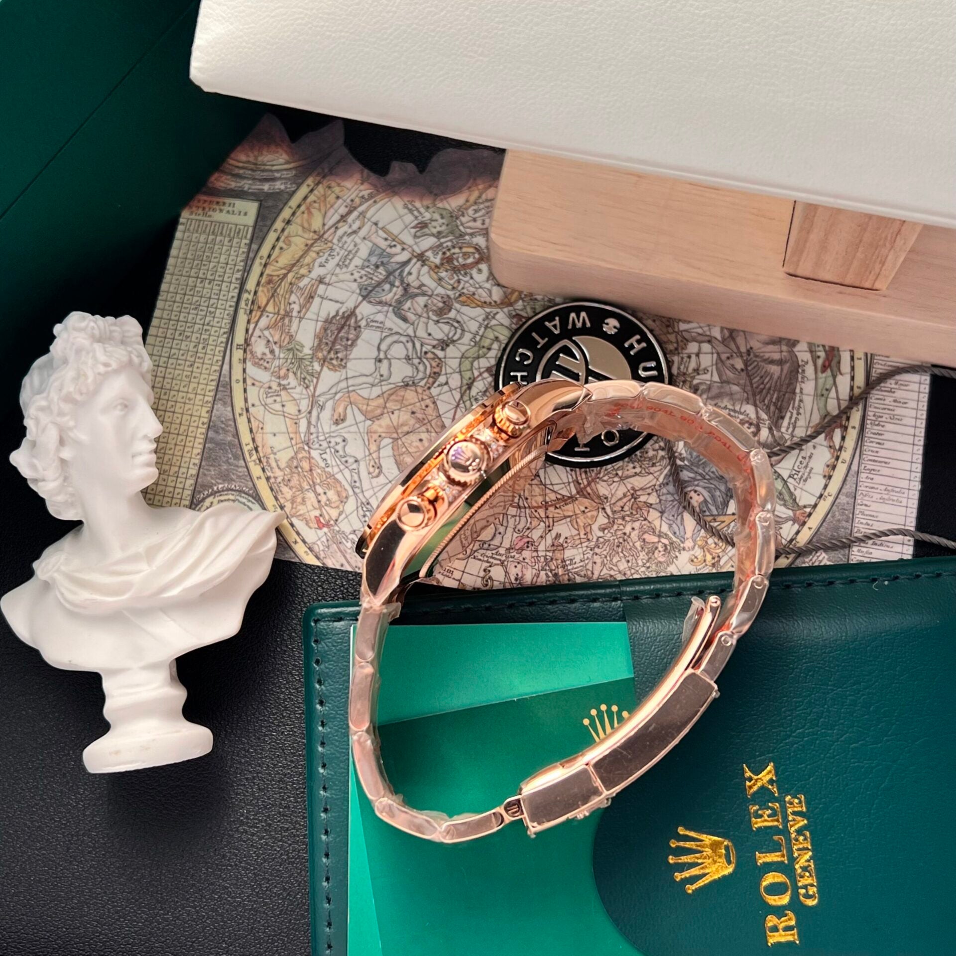 Κατασκευασμένο με ροζ χρυσό 904L stainless steel wrapped κάσα, το ρολόι ενσωματώνει τον αξιόπιστο Swiss Clone Cal.4130 αυτόματο μηχανισμό με λειτουργία χρονογράφου, ενώ ο μαύρος rubber strap (Oysterflex τύπου) προσφέρει άνεση και σταθερότητα στον καρπό.
