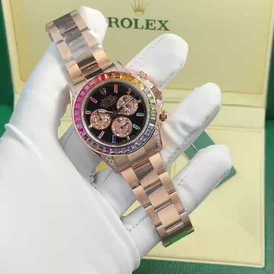 Ζήστε την απόλυτη πολυτέλεια με το Rolex Daytona 116595 Rainbow, σε ρεπλίκα κορυφαίας ποιότητας από την BT Factory. Με Moissanite Rainbow bezel, διαμάντια στο καντράν, και Rose Gold εμφάνιση (18K Gold Wrapped), αυτό το ρολόι συνδυάζει ακρίβεια, φινέτσα και στυλ υψηλής κλάσης — μία από τις πιο εντυπωσιακές 1:1 ρεπλίκες στην αγορά.