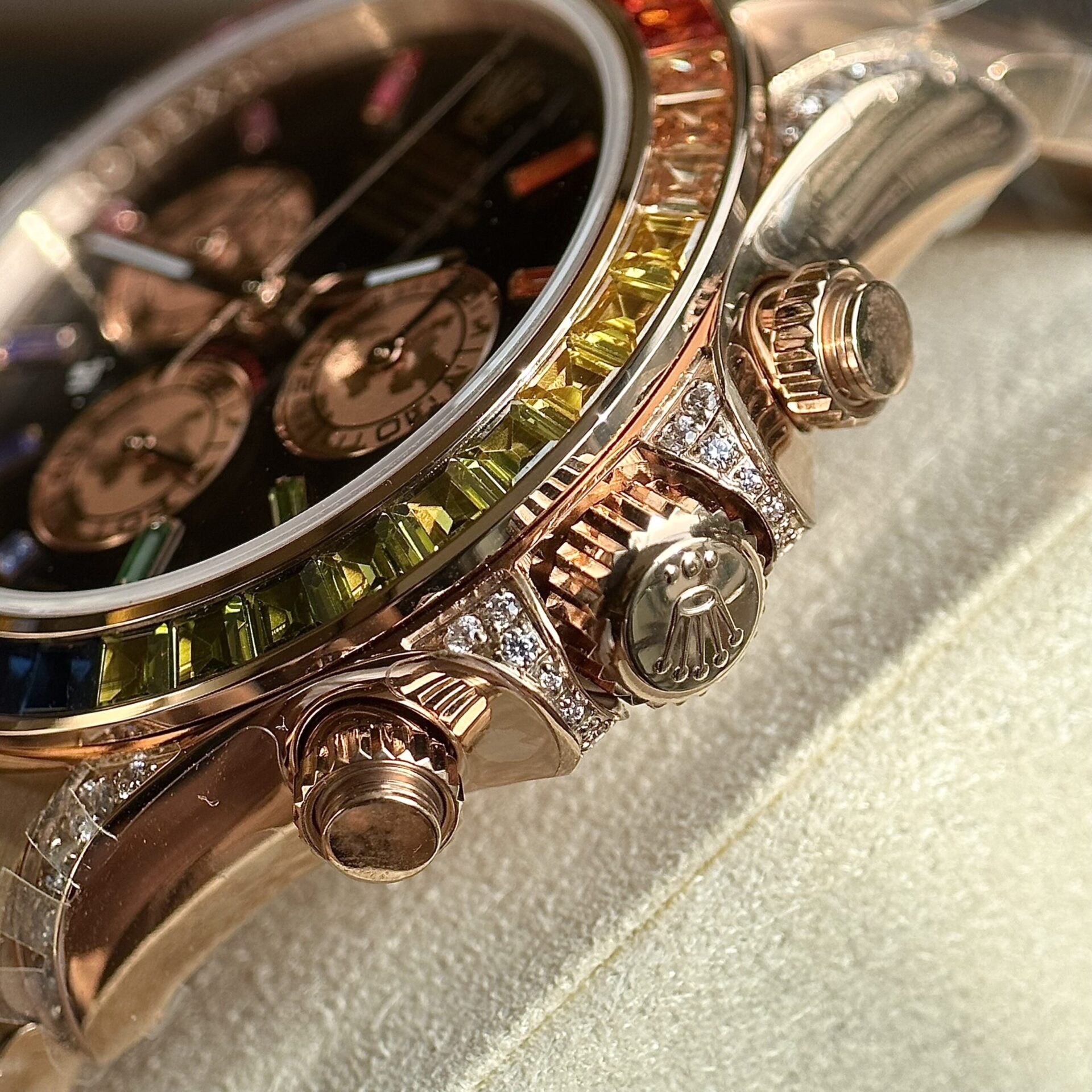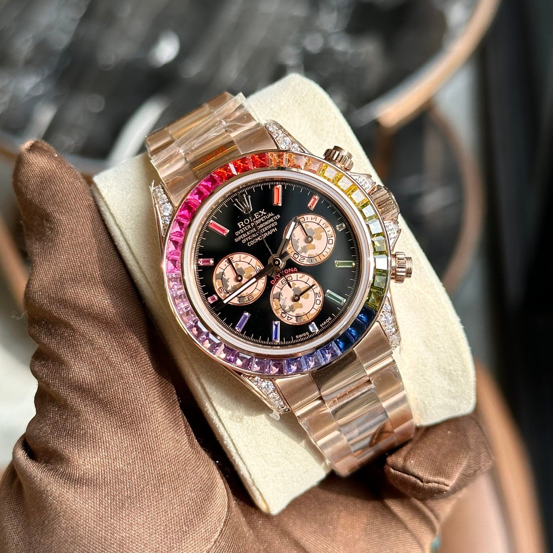 Εντυπωσιακό και εκκεντρικό, το Rolex Daytona Rainbow Replica 40mm με μαύρο καντράν από την αξιόπιστη TW Factory ξεχωρίζει χάρη στην πολύχρωμη "rainbow" διακόσμηση στην στεφάνη του. Μια υψηλής ποιότητας ρεπλίκα που συνδυάζει την σπορ κομψότητα του Daytona με μοναδική λάμψη και στιλ.