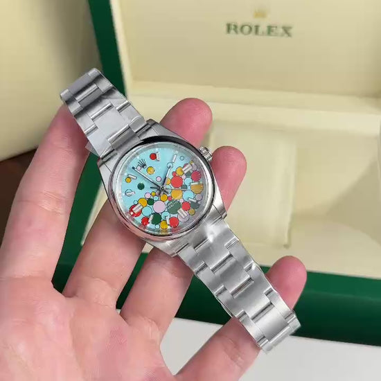 Το Rolex Oyster Perpetual 124300 Celebration Dial Replica 36mm από την Clean Factory είναι μία εξαιρετικά ποιοτική 1:1 ρεπλίκα που εντυπωσιάζει με το μοναδικό της σχέδιο. Το χαρακτηριστικό "Celebration Dial" με πολύχρωμες στρογγυλές λεπτομέρειες πάνω σε τιρκουάζ βάση συνδυάζεται άψογα με το κλασικό Oyster μπρασελέ και τον Swiss Clone μηχανισμό, προσφέροντας κομψότητα και φρεσκάδα.