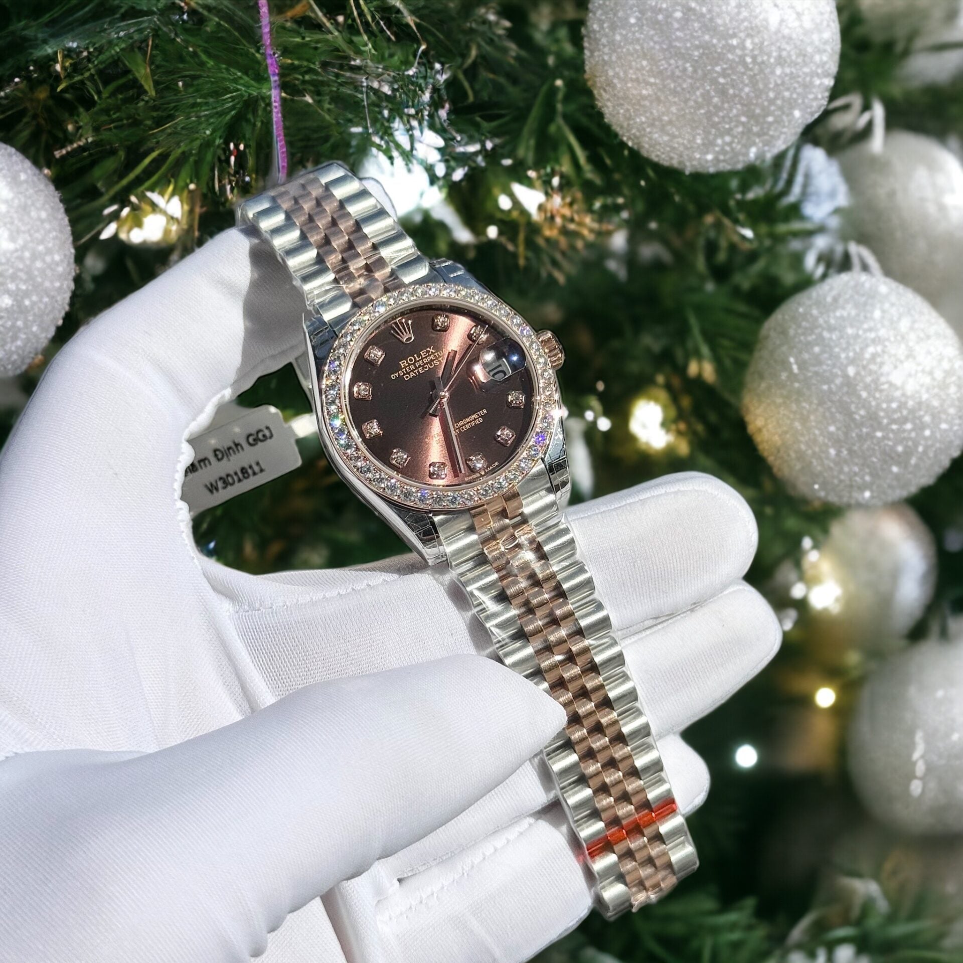 Rolex Replica Watch DateJust Chocolate Dial Custom Benzel Moissanite Diamonds 31mm Clone