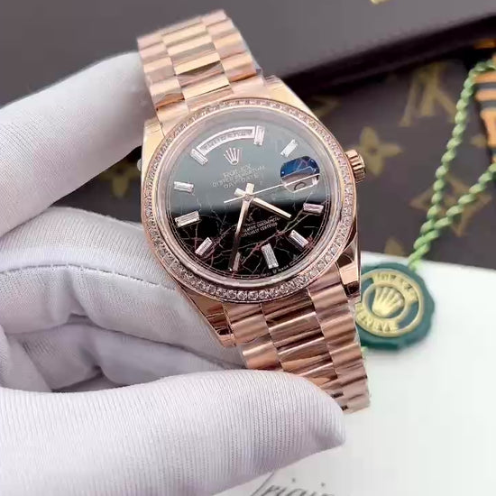 Το Rolex Day-Date Replica 40mm από την GS Factory συνδυάζει την πολυτέλεια της χρυσής επίστρωσης (Gold Wrapped) με την εκλεπτυσμένη λάμψη των μοϊσανίτη διαμαντιών, τοποθετημένων σε καντράν Eisenkiesel που προσθέτει μοναδικό χαρακτήρα και βάθος στο ρολόι. Με βάρος περίπου 177 γραμμάρια, προσφέρει στιβαρότητα και άνεση στον καρπό, ιδανικό για όσους αναζητούν κομψότητα και υψηλή ποιότητα.