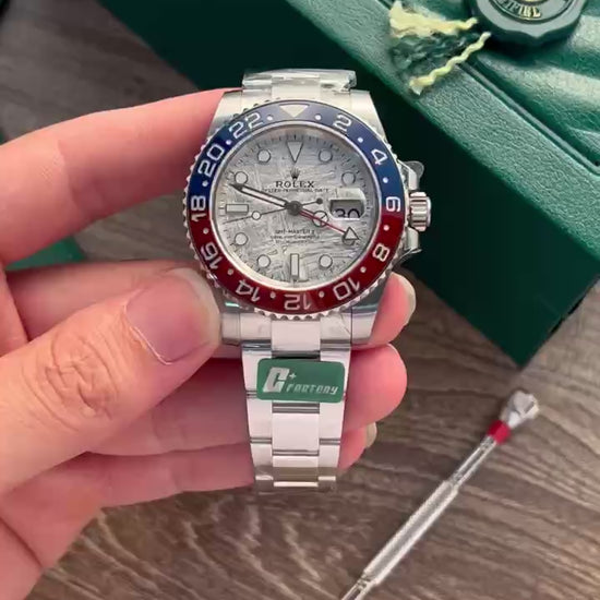 Αποκτήστε τον απόλυτο συνδυασμό κοσμικής κομψότητας και ταξιδιωτικής λειτουργικότητας με αυτή την εξαιρετική ρεπλίκα του Rolex GMT-Master II 126719BLRO. Το καντράν από μετεωρίτη προσφέρει μοναδική υφή και λάμψη, ενώ η χαρακτηριστική μπλε-κόκκινη "Pepsi" στεφάνη υπογραμμίζει την ταυτότητα του GMT-Master.